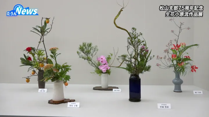 生け花の小原流松山支部の創立75周年を記念した作品展「で愛 花・小原流」が18日、