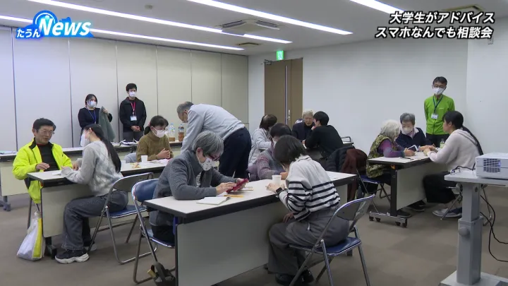 12月17日伊予市双海地域事務所でスマホなんでも相談会が行われた。この相談会は伊予市と連携協定を結ぶ松山大学とソフトバンクの協力のもと開催された。この日は伊予市双海町などから60〜80歳代の8名が参加した。
