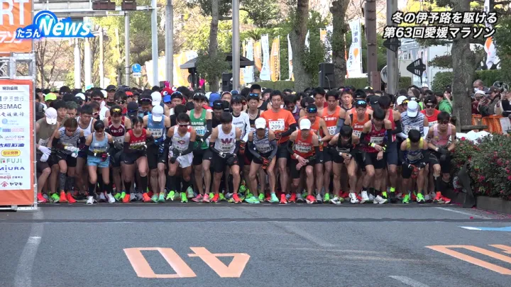 2月1日第63回愛媛マラソンが松山市で開催され過去最多となるおよそ1万1千人のランナーが冬の伊予路を駆け抜けた。気温5度と冷え込む中ランナーは午前10時に県庁前をスタート、松山市北条地区を折り返して、ゴール地点の城山公園を目指した。