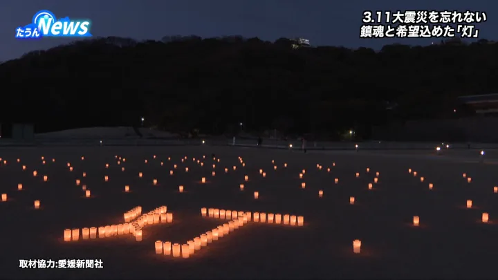 東日本大震災の発生から15年を迎えた3月11日、千個のろうそくをともして犠牲者を追悼する「まつやま万灯会(まんとうえ)」が夕方から、松山市堀之内の城山公園で開かれました。