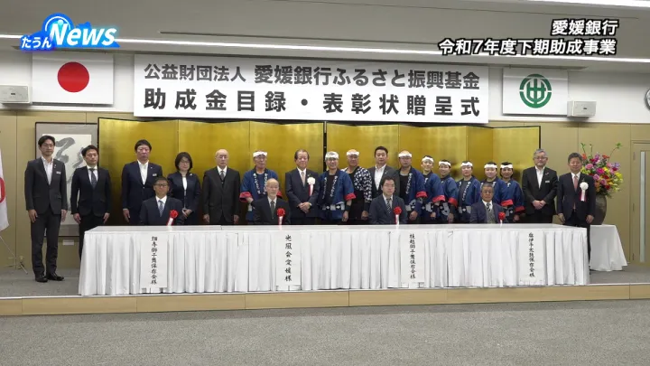 地域情報 地域情報 愛媛銀行ふるさと振興基金贈呈式 2026年3月14日(土) ツイート 3月12日、愛媛銀行研修所で地域文化の振興を目的とした助成金目録及び表彰状の贈呈式が行われました。今回は県内から4団体に助成金が贈られました。