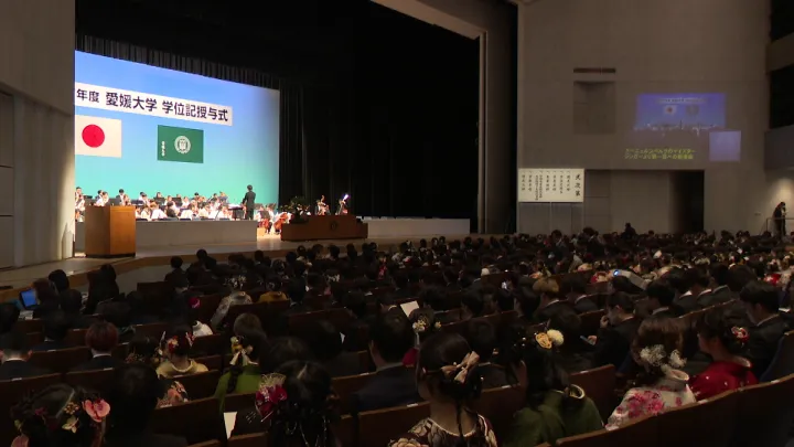 地域情報 地域情報 令和7年度愛媛大学学位記授与式 2026年3月26日(木) ツイート 3月24日、愛媛県県民文化会館で愛媛大学の学位記授与式が行われました。式では各学部や研究科の卒業生代表者に学位記が手渡されました。
