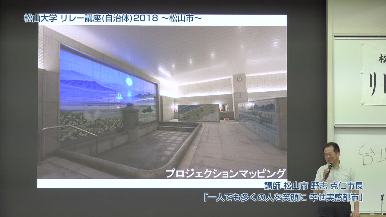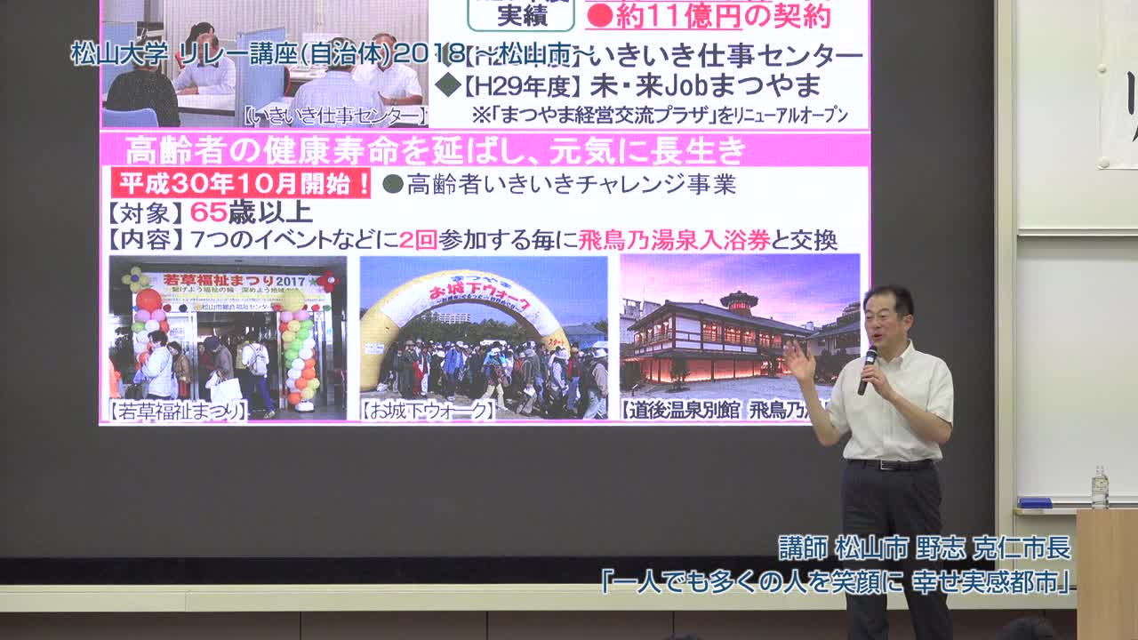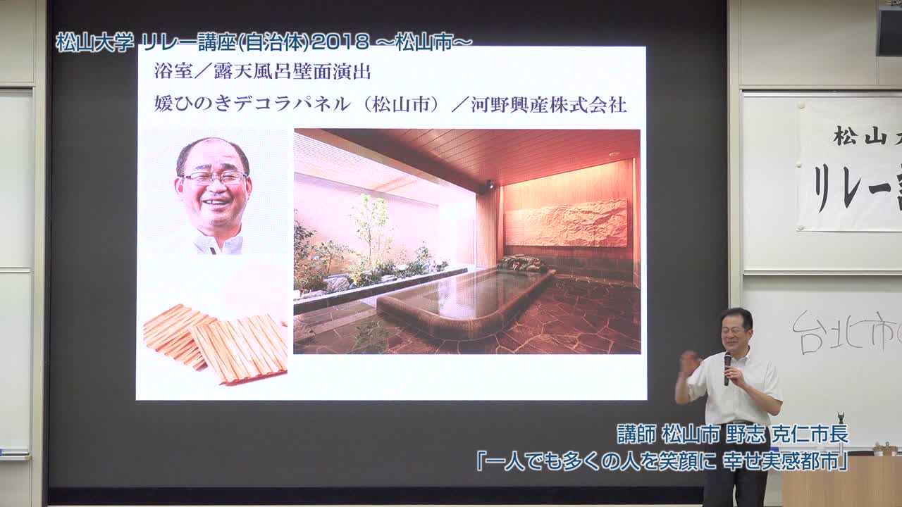 松山市長・野志克仁氏が松山大学で講演し、松山市の子育て支援や高齢者就労支援、環境モデル都市としての取り組みを紹介。道後温泉の魅力向上や観光戦略、歴史的背景を活かした新しい入浴体験についても触れ、市民参加型政策の重要性を強調した。