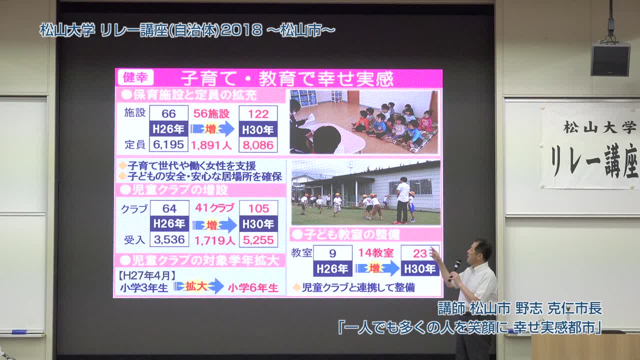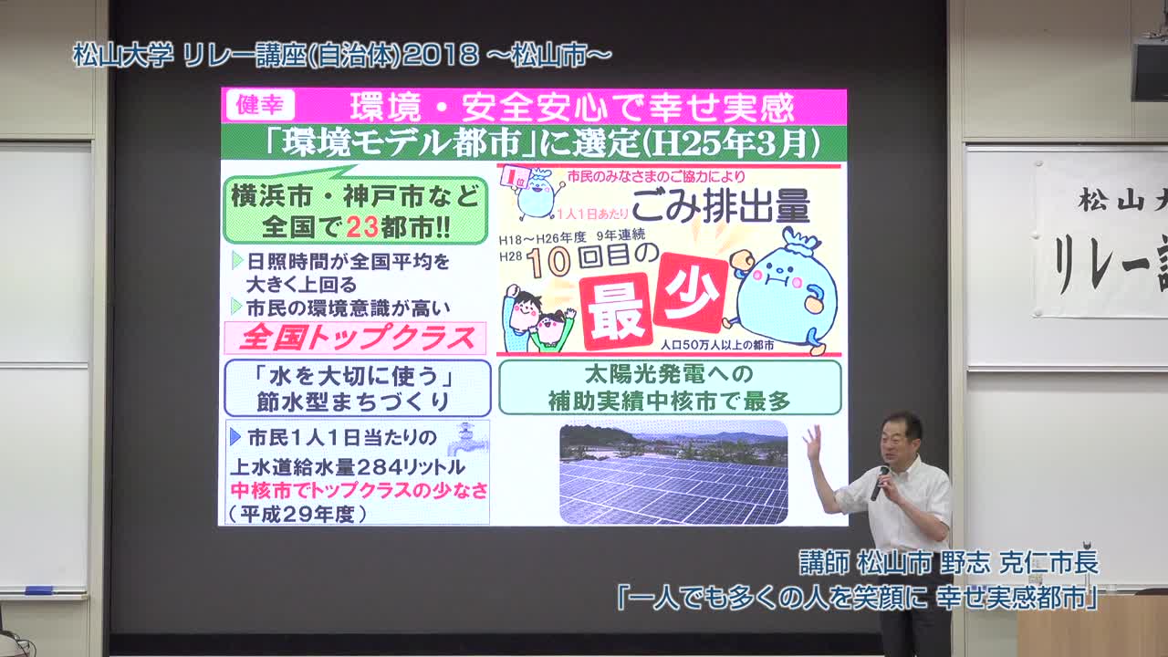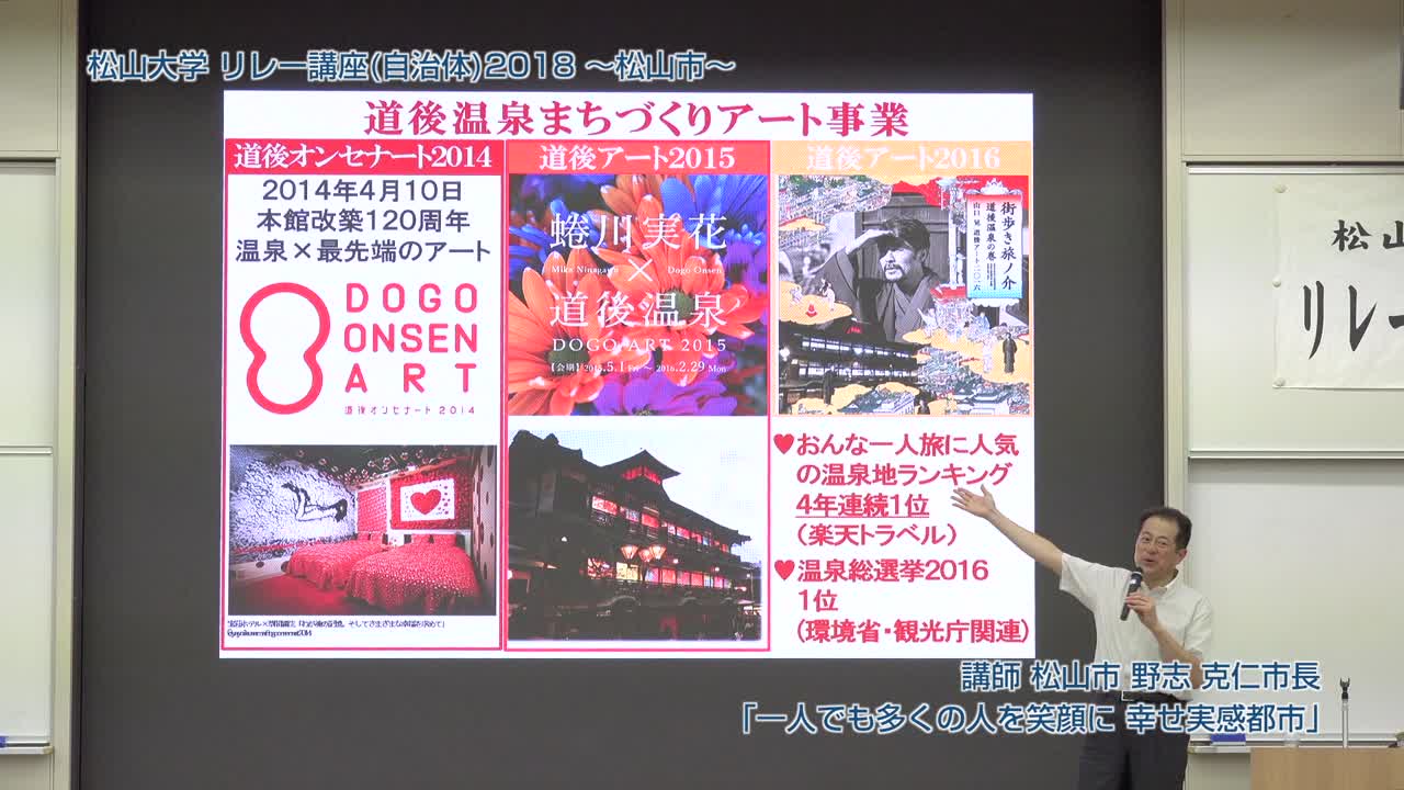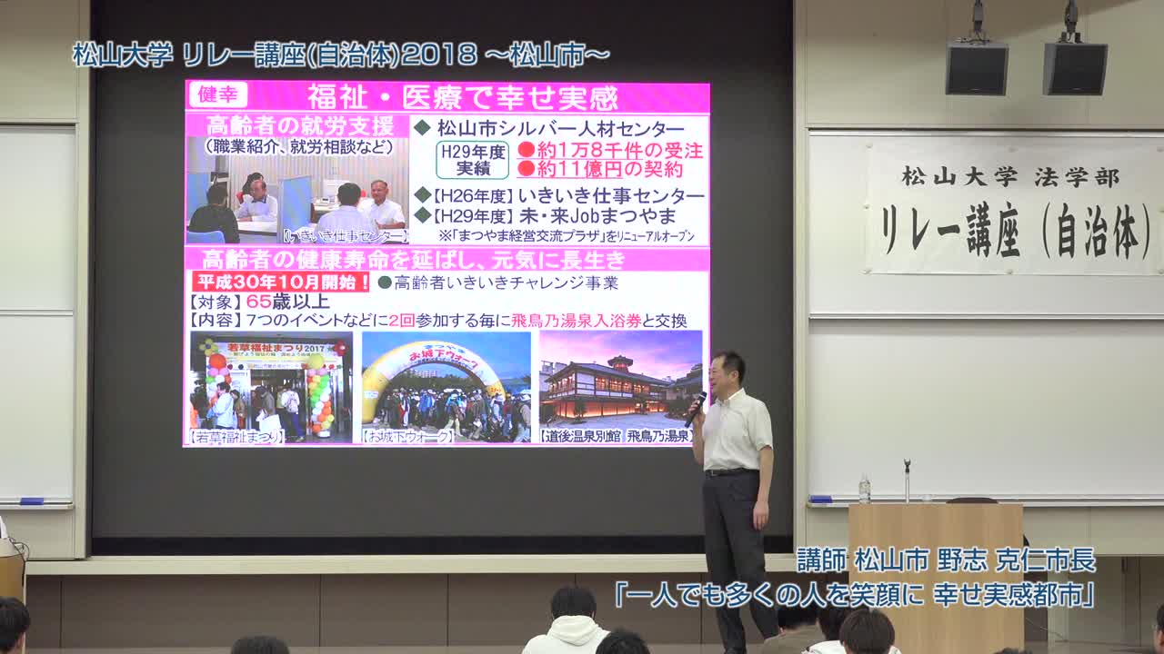 松山市長・野志克仁氏が松山大学で講演し、松山市の子育て支援や高齢者就労支援、環境モデル都市としての取り組みを紹介。道後温泉の魅力向上や観光戦略、歴史的背景を活かした新しい入浴体験についても触れ、市民参加型政策の重要性を強調した。