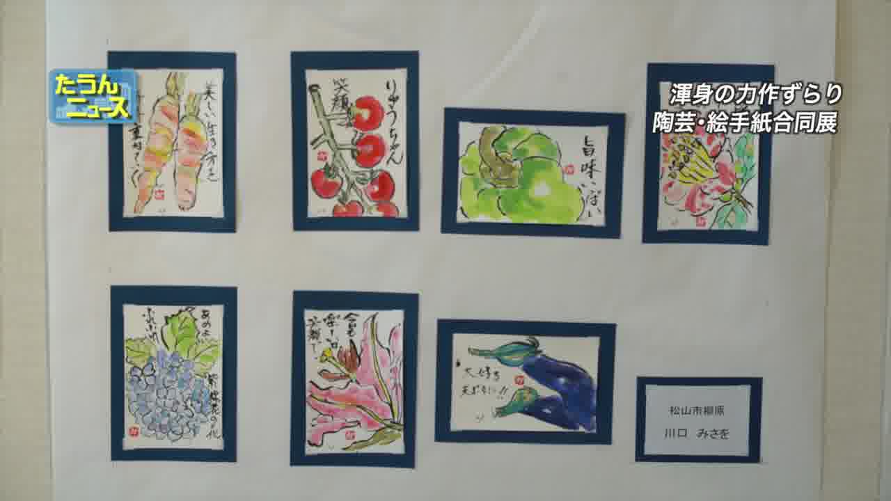 松山市の宝城ふるさと館で陶芸と絵手紙の合同作品展が開催中。陶芸教室の15人と絵手紙教室の34人の生徒が、日々の活動の成果を披露する場となっている。展示作品には絵や食器、植木鉢などがあり、生徒たちが自分の個性を活かして制作したものが並ぶ。展覧会は28日まで開催される。