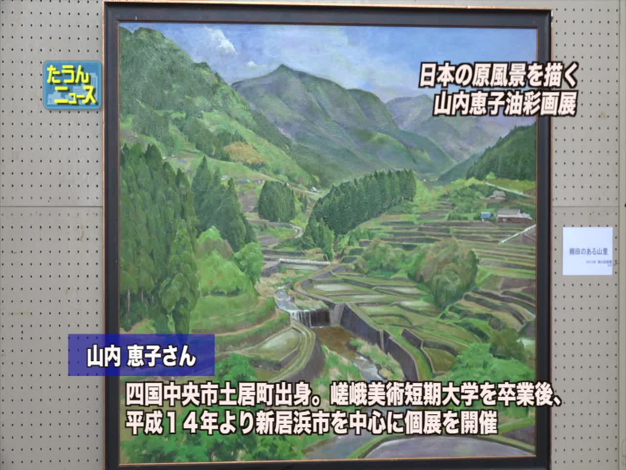 東温市中央公民館で山内恵子の油彩画展が開催中。四国中央市出身の山内は嵯峨美術短期大学卒業後、新居浜市で活動。今回のテーマは東温市の棚田で、入選作を含む12点が展示されている。棚田の美しさが訪問者を魅了している。展覧会は3月30日まで。