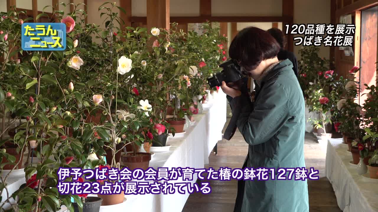 松山城二ノ丸史跡庭園で第21回松山城二ノ丸椿名花展が開催中。与椿協会主催のこのイベントでは、127鉢の鉢花と23点の切花が展示され、訪れた人々を魅了している。苗木の展示即売会も行われ、人気を集めている。開催期間は3月18日まで。