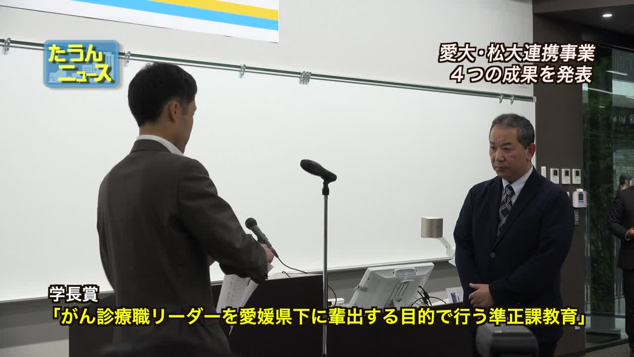 愛媛大学と松山大学の連携事業成果報告会が松山大学で開催され、約80人が参加した。特に、愛媛大学の薬師陣教授が主導するがん診療職リーダー育成プロジェクトが学長賞を受賞。このプロジェクトは質の高いがん治療を行う医療者を育成することを目指している。報告会後には両大学の交流を深める懇親会も行われた。