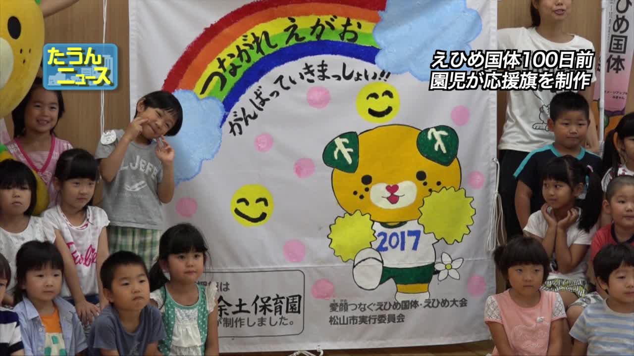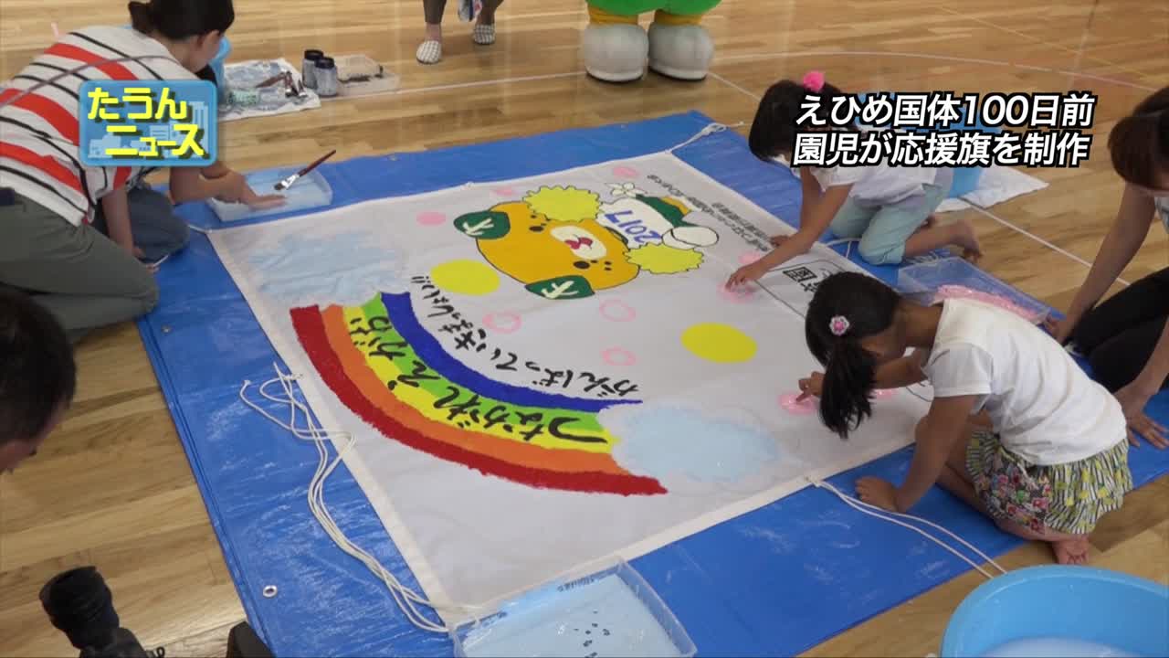 愛媛国体開催100日前を記念して、松山市の余土保育園で園児たちが応援旗を制作した。みきゃんと一緒に笑顔マークや虹を描いた旗は、国体の競技会場で選手たちを応援するために展示される。子どもたちの手作り応援旗が天皇杯獲得を目指す選手たちを後押しする。