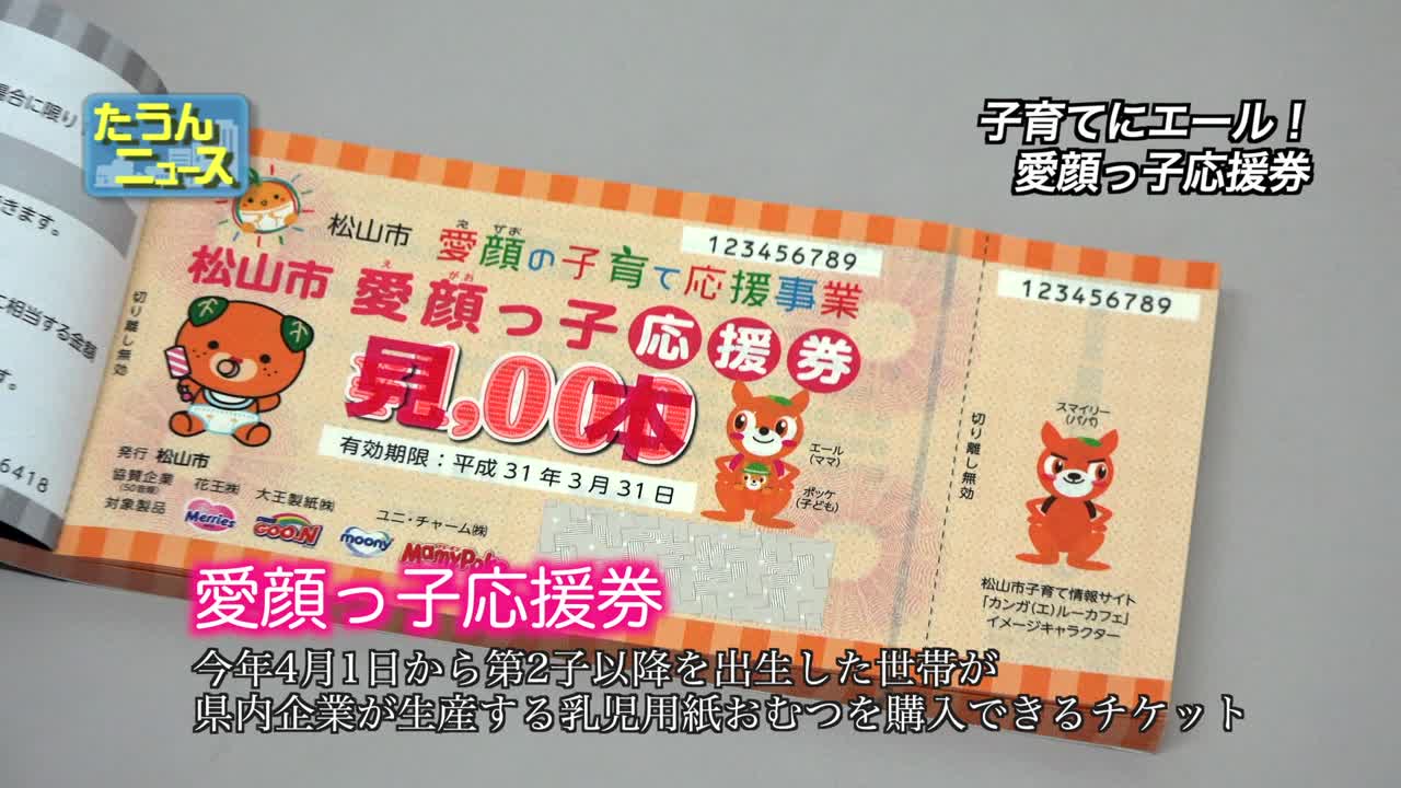 松山市が子育て支援サービス「愛顔っ子応援券」の申請受付を開始。第2子以降の乳児の保護者に、県内企業の乳児用紙おむつ購入に使える5万円分のチケットを交付する。申請は市役所や各窓口で可能で、期限は乳児の1歳の誕生日の前日まで。少子化対策と地域経済活性化を目的とする。