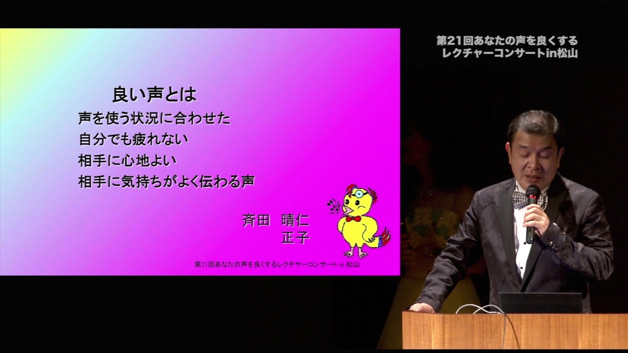 斉田晴仁が声の健康をテーマに、医学的視点から発声法を解説するレクチャーコンサート。声の仕組みや呼吸法、声帯振動の原理を科学的に探求し、参加者に正しい発声法を提供する。松山で初開催され、音響分析や声のデザイン技術も紹介される多彩なプログラムが展開される。