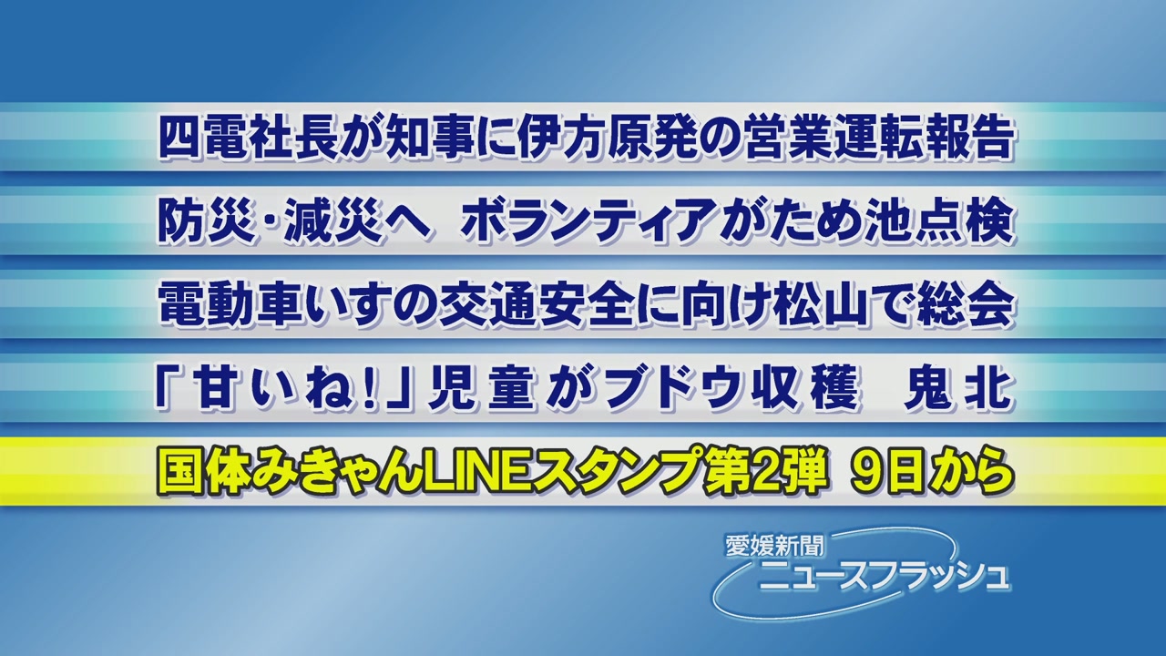 四国電力の伊方原発3号機が営業運転を開始し、佐伯社長が廃止措置計画を12月までに策定予定と報告。愛媛県では防災支援と電動車いすの安全対策が進行中。鬼北町ではブドウ収穫祭が開催され、愛媛国体のLINEスタンプ第2弾が発表された。