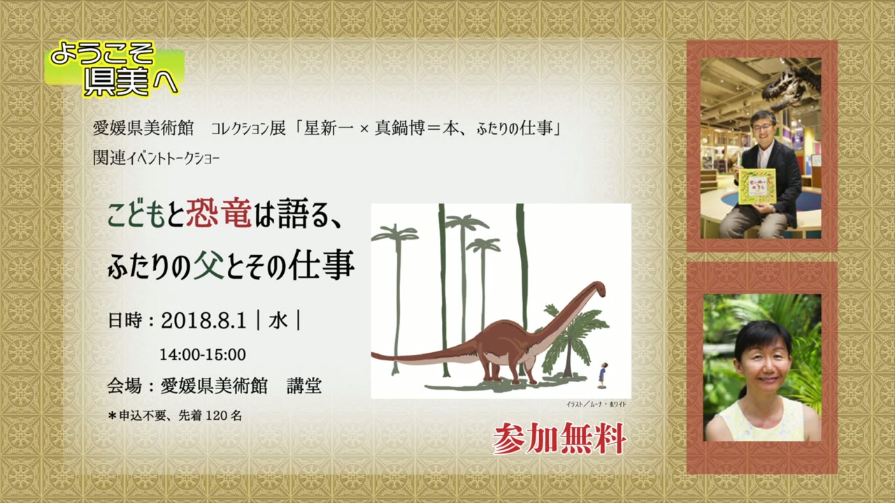 愛媛県美術館で開催中の『星新一×真鍋博=本 二人の仕事展』に関連し、星新一の娘・星マリナと真鍋博の長男・真鍋真がトークショーを行う。『午後の恐竜』を中心に二人の仕事を振り返り、星マリナは書籍の発信、真鍋真は恐竜研究者の視点から作品を解釈する。サイン会や関連イベントも予定されている。