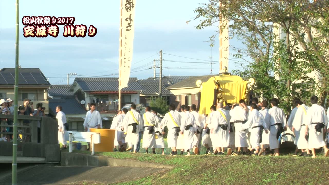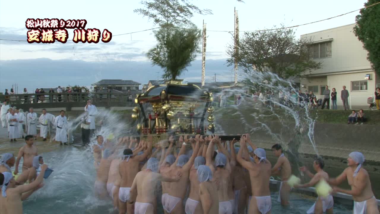 安城寺にまつわる伝説と愛媛県松山市で開催される秋祭りについて紹介する。特に、神体を勝岡神社に移す際の苦労が川狩りの由来となった話や、2017年の松山秋祭りでの川狩りの様子が取り上げられている。