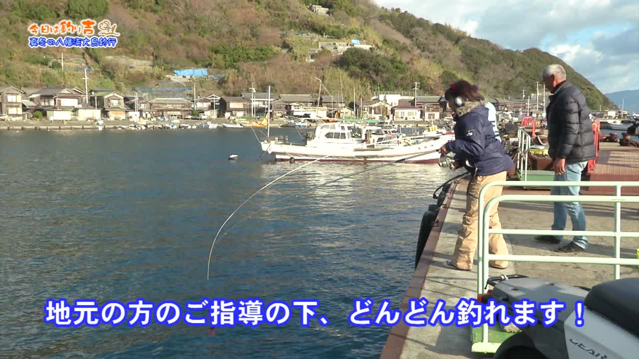 八幡浜市の大島での冬の釣り体験を紹介。サビキ釣りでアジを釣り、大物を狙う様子が描かれる。道岡さんや菅原さんが釣り指南を行い、アジやメバルが釣れる楽しさを伝える。釣りたての魚をその場で味わい、島カレーや地元の特産品も堪能できる。レンタサイクルでの観光も魅力的。