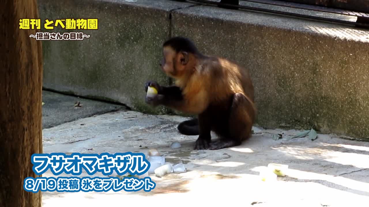 とべ動物園のフサオマキザルと氷の果物チャレンジ