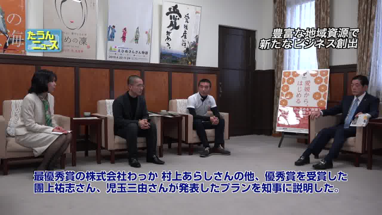 2018年と2019年のEGFアワード受賞者が愛媛県庁で中村知事に受賞報告を行った。EGFアワードは地域資源を活用したビジネスプランを評価するもので、最優秀賞の村上あらし氏らがプランを説明。県内資源を活用した新ビジネスの創出に期待が高まっている。