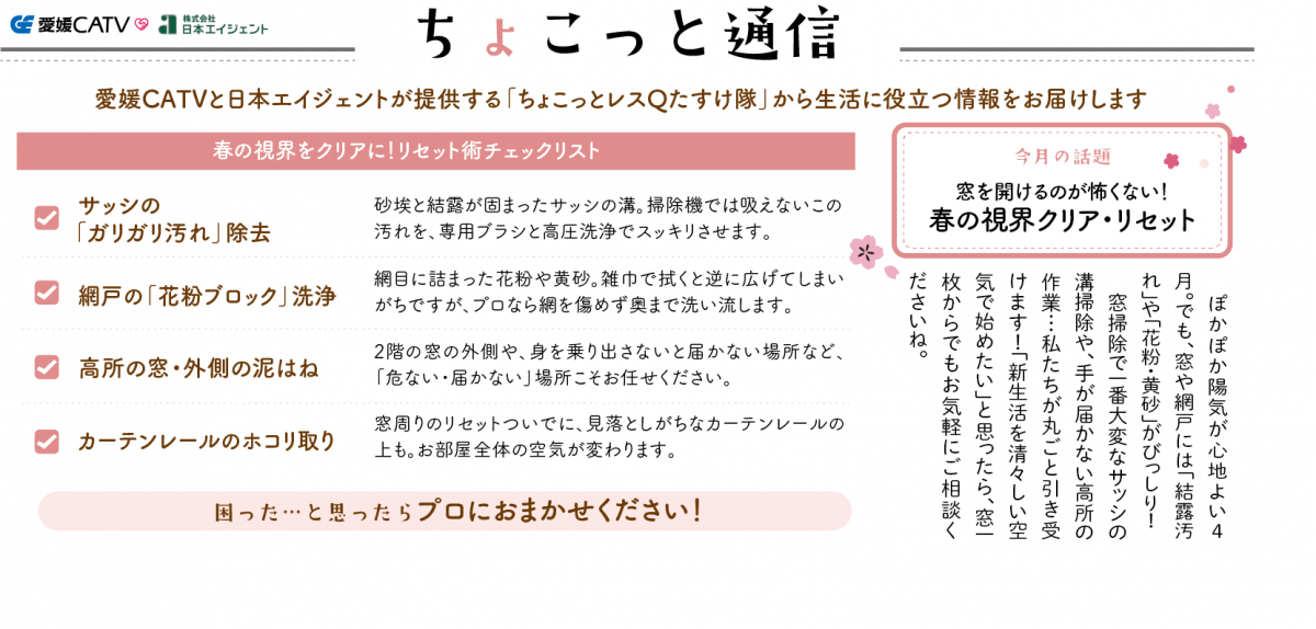 ちょこっとレスQたすけ隊 TOP > ちょこっとレスQたすけ隊 ちょこっとレスQたすけ隊とは? 利用料金 お客様の声 ご利用の流れ 今月のちょこっと通信 よくある質問 これまで実施してきた「ちょこっとお手伝いサービス」だけでは対応できなかった生活支援サービスのご要望にお応えするため、日本エイジェントと連携してサービスの幅を広げました。 「ちょこっとレスQたすけ隊」とは? 愛媛CATVと日本エイジェントがタッグを組んでご提供する「住まいのお困りごと」解決サービスです。 経験豊富なスタッフが、電気関係や水回りのトラブルはもちろん、建具調整や害虫駆除など、 住まいに関する様々なお困りごとの相談を受けて、解決いたします。 対応メニュー・料金 愛媛CATVと日本エイジェントがタッグを組んでご提供する「住まいのお困りごと」解決サービスです。 経験豊富なスタッフが、電気関係や水回りのトラブルはもちろん、建具調整や害虫駆除など、 住まいに関する様々なお困りごとの相談を受けて、解決いたします。 上記以外にも住まいに関わるお困りごとに幅広く対応できます。※基本料金を超える作業の場合には別途お見積りさせていただきます。 お客様の声 家具の移動 家具の移動 家具の移動 ご利用の流れ お困りごとの受付から解決まで、簡単4ステップで進みます。現地訪問・お見積りまで、無料で対応いたします。 FAQ特に見られているご質問 Q見積りだけでも来てもらえますか? 20 A もちろん、お見積りだけでの訪問も可能です。また、見積りだけで費用が発生することはございませんのでご安心ください。 Q深夜、土日祝でも来てもらえますか? 20 A 誠に申し訳ございませんが、営業時間内(平日10:00~18:00)での訪問となります。 よくある質問一覧はこちら