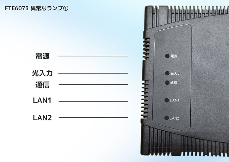 FTE6073 TOP > お客さまサポート一覧 > インターネットサポート > 繋がりが悪いと感じたら > FTE6073 FTE6073のランプ状態の確認・機器再起動については以下の各種マニュアルをご確認ください。 機器ランプの確認 正常なランプの状態 ランプ項目 ランプ状態 電源 緑点灯 ● 光入力 緑点灯 ● 通信 緑点灯 ● ・ 緑点滅 ● LAN1 緑点灯 ● ・ 緑点滅 ● LAN2(※) 緑点灯 ● ※固定電話サービスをご契約の場合はLAN2が緑に点灯・点滅いたします。 異常なランプの状態① ランプ項目 ランプ状態 電源 消灯 ● 光入力 消灯 ● 通信 消灯 ● LAN1 消灯 ● LAN2 消灯 ● 電源に問題がある可能性がございます。電源コンセント側と本体側差し込みプラグが抜けや、ブレーカー落ち・電源タップのスイッチがOFFになっていないかご確認ください。改善しない場合は愛媛CATVコールセンターまでお問い合わせください。 異常なランプの状態② ランプ項目 ランプ状態 電源 緑点灯 ● 光入力 消灯 ● 通信 消灯 ● LAN1 消灯 ● LAN2 消灯 ● 一時的な機器不具合の可能性があります。機器の電源をコンセントから抜き、30秒後に再度コンセントに差し込んでください。再起動後に改善しない場合は愛媛CATVコールセンターまでお問い合わせください。 ご使用端末の確認 通信機器(ONU)のランプが正常な状態でもご使用端末(パソコンやスマートフォン等)がインターネットに繋がらない場合、ご使用端末の再起動(電源入れ直し)で改善する場合がございます。ご使用端末の再起動で改善しない場合にはWi-Fi設定の確認や、機内モード等になっていないか等をご確認ください。 サポート動画 電源の入れ直し メーカー設定