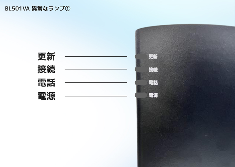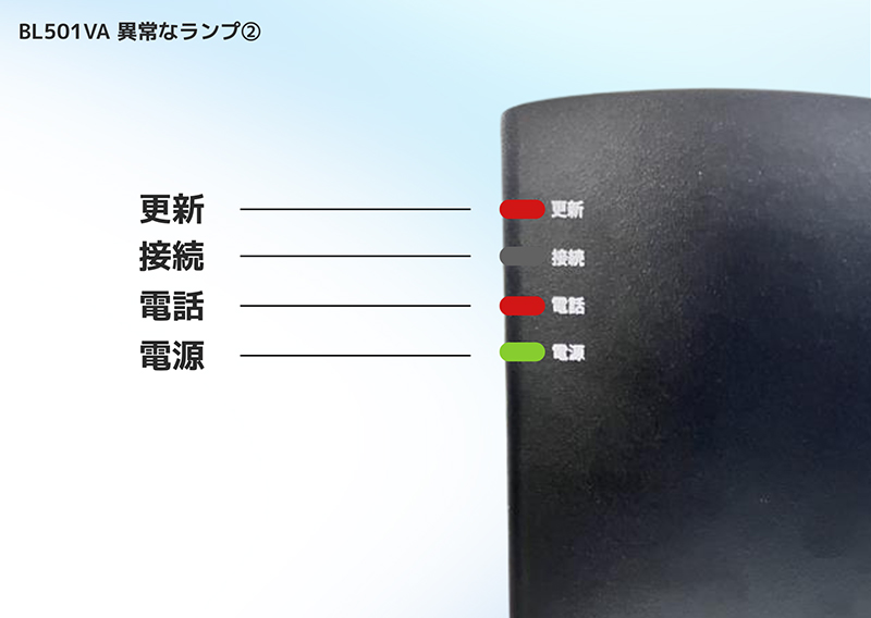 BL501VA TOP > お客さまサポート一覧 > 固定電話サポート > 電話がつながらない場合は > BL501VA BL501VAのランプ状態の確認・機器再起動については以下の各種マニュアルをご確認ください。 機器ランプの確認 正常なランプの状態 ランプ項目 ランプ状態 更新 消灯 ● 接続 緑点灯 ● 電話 緑点灯 ● 電源 緑点灯 ● 異常なランプの状態① ランプ項目 ランプ状態 更新 消灯 ● 接続 消灯 ● 電話 消灯 ● 電源 消灯 ● 電源に問題がある可能性がございます。電源コンセント側と本体側差し込みプラグが抜けや、ブレーカー落ち・電源タップのスイッチがOFFになっていないかご確認ください。改善しない場合は愛媛CATVコールセンターまでお問い合わせください。 異常なランプの状態② ランプ項目 ランプ状態 更新 赤点灯 ●・ 橙点灯 ● 接続 消灯 ● 電話 赤点灯 ● 電源 緑点灯 ● 一時的な機器不具合の可能性があります。機器の電源をコンセントから抜き、30秒後に再度コンセントに差し込んでください。再起動後に改善しない場合は愛媛CATVコールセンターまでお問い合わせください。 サポート動画 電源の入れ直し メーカー設定