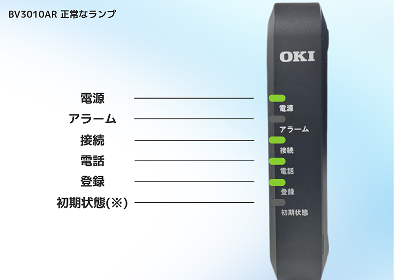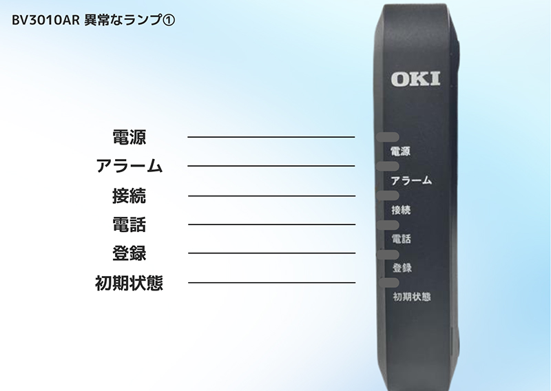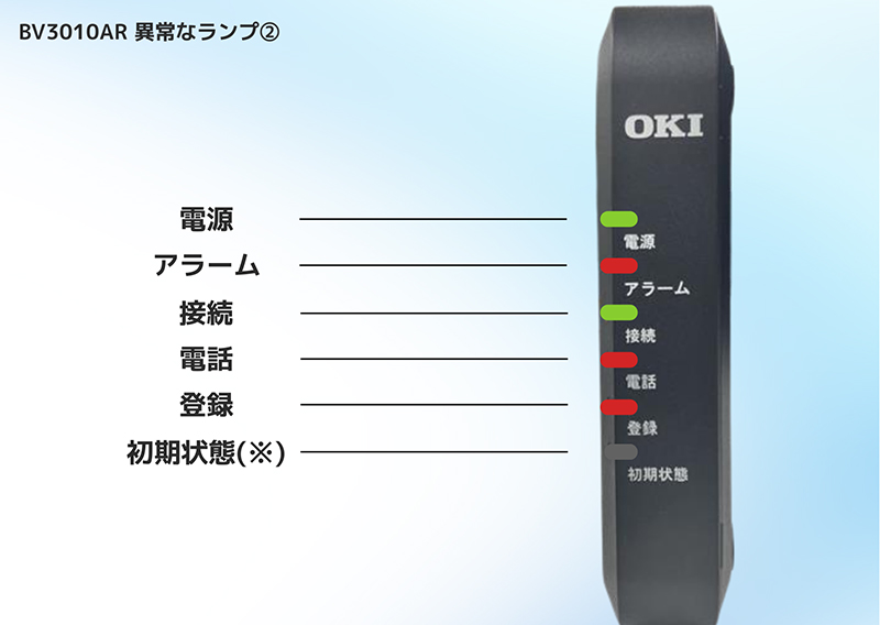 BV3010AR TOP > お客さまサポート一覧 > 固定電話サポート > 電話がつながらない場合は > BV3010AR BV3010ARのランプ状態の確認・機器再起動については以下の各種マニュアルをご確認ください。 機器ランプの確認 正常なランプの状態 ランプ項目 ランプ状態 電源 緑点灯 ● アラーム 消灯 ● 接続 緑点灯 ● 電話 緑点灯 ● ・ 緑点滅 ● 登録 緑点灯 ● 初期状態(※) 消灯 ● ・ 橙点灯 ● ※「発信番号表示」を設定していない場合は橙点灯いたします。 異常なランプの状態① ランプ項目 ランプ状態 電源 消灯 ● アラーム 消灯 ● 接続 消灯 ● 電話 消灯 ● 登録 消灯 ● 初期状態 消灯 ● 電源に問題がある可能性がございます。電源コンセント側と本体側差し込みプラグが抜けや、ブレーカー落ち・電源タップのスイッチがOFFになっていないかご確認ください。改善しない場合は愛媛CATVコールセンターまでお問い合わせください。 異常なランプの状態② ランプ項目 ランプ状態 電源 緑点灯 ● アラーム 赤点灯 ●・赤点滅 ● 接続 緑点灯 ● 電話 赤点滅 ● 登録 赤点滅 ● 初期状態(※) 消灯 ● ・ 橙点灯 ● ※「発信番号表示」を設定していない場合は橙点灯いたします。いずれかのランプが赤点滅している場合、一時的な機器不具合の可能性があります。機器の電源をコンセントから抜き、30秒後に再度コンセントに差し込んでください。再起動後に改善しない場合は愛媛CATVコールセンターまでお問い合わせください。 サポート動画 電源の入れ直し メーカー設定