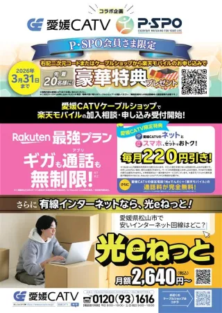 おしらせ お知らせ 限定端末キャンペーン!全ショップ特別販売イベントのお知らせ 2026/3/9 おしらせ お知らせ 自治体チャンネルの終了について 2026/3/6 おしらせ お知らせ おトクがいっぱい!愛媛CATV×P・SPO キャンペーン 2026/3/4 おしらせ おしらせ 2027年度(2027年4月入社)新卒採用のエントリー受付を開始しました 2026/3/2 おしらせ お知らせ 【生放送】速報!愛媛県立高校入試問題解答2026 2026/3/2 おしらせ お知らせ BS10プレミアム(BS201ch)放送設備切替に伴う受信待機のお願いと、録画予約に関するご注意 2026/3/2 おしらせ お知らせ 3G回線終了のお知らせ 2026/2/26 おしらせ お知らせ 「フジテレビNEXT ライブ・プレミアム」月額利用料金改定のお知らせ 2026/2/1 おしらせ お知らせ eてれびStick3カ月無料キャンペーン実施中! 2026/1/17 おしらせ お知らせ 「エンタメ~テレHD☆シネドラバラエティ」リニューアルおよび「ダンスチャンネル by エンタメ~テレ」放送終了のお知らせ 2026/1/13 1 2 3 … 12 次へ