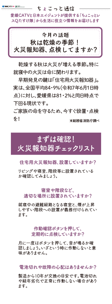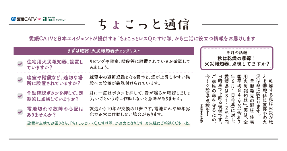 愛媛CATVと日本エイジェントがタッグを組んでご提供する「住まいのお困りごと」解決サービスです。 経験豊富なスタッフが、電気関係や水回りのトラブルはもちろん、建具調整や害虫駆除など、 住まいに関する様々なお困りごとの相談を受けて、解決いたします。