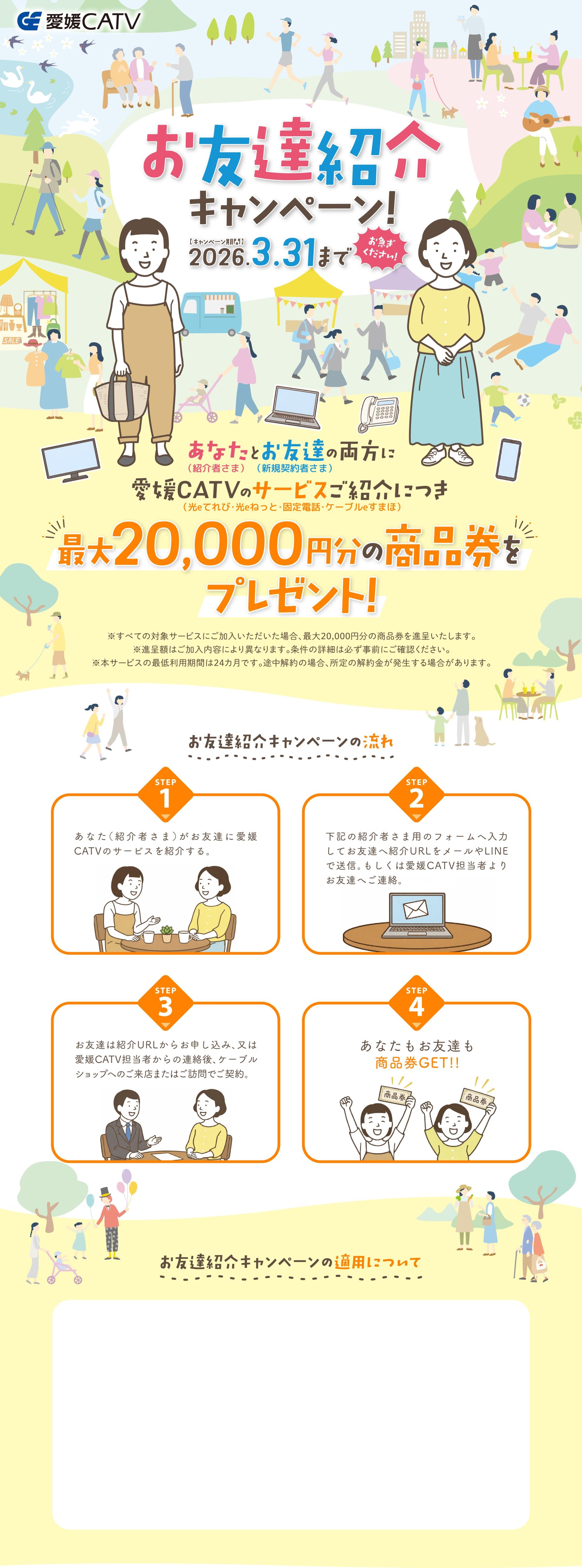 - 紹介者さまが弊社サービス(光eてれび・光eねっと・固定電話・ケーブルeすまほ)のいずれかのご利用があることが条件となります。